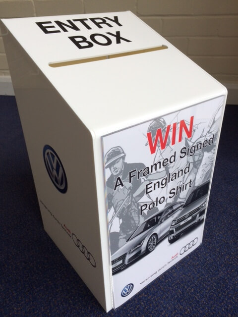 Display Graphics – Cut Vinyl Stickers and Framed Print for a competition entry box for a Vehicle Showroom in Colchester